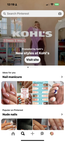 Early testing. The latest version of the Pinterest mobile app features the new ad style with a Kohl’s promotion. The ad includes a brief video with overlaid text and a button that directs users to Kohl’s website, which opens within the Pinterest app, rather than a separate tab.