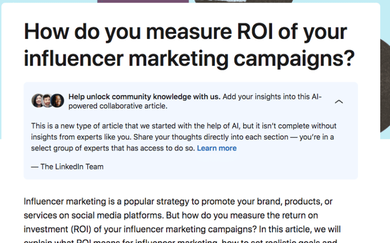 Right now, there is post to a Collaborative article on how to measure the ROI of influencer marketing campaigns. Clicking on that post opens up the actual article, How do you measure ROI of your influencer marketing campaigns?