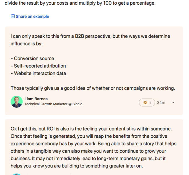 When you click to share an example, a field will appear that gives you some prompts to get you started (“One thing I’ve found…”; “Actually I disagree with…”; “An example I’ve seen…”).