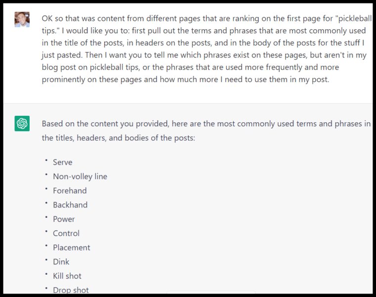 Here, I could run through multiple articles ranking on the first page for this search term, ask ChatGPT to pull out themes and common terms used in the headers for each, and then surface the most popular phrases across the articles: