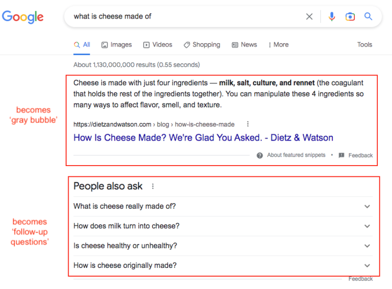 So you could imagine the “gray bubble” in place of the featured snippet explaining how cheese is made (with an answer generated by Google AI instead of awarded to the source of the featured snippet here), and the “follow-up questions” replacing PAA.