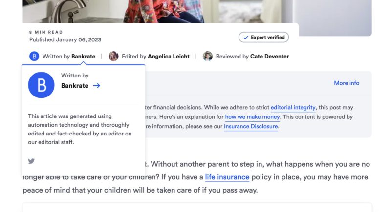 Bankrate isn’t the only example of this. CreditCards.com is also using AI-generated content. The first line of the CreditCards.com Team author page says “Content published under this author byline is generated using automation technology.”