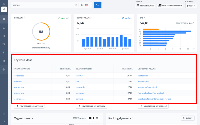 SE Ranking’s Keyword Research tool ticks every box in this respect. Plus, it’s a part of a larger ecosystem of tools, meaning you can seamlessly manage all of your site’s data from one central hub.