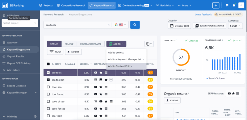 Instead, you can directly add the keywords you’re interested in targeting to one of SE Ranking’s tools. These include Keyword Manager, Keyword Rank Tracker and Content Editor (this tool is where all the content creation magic happens).