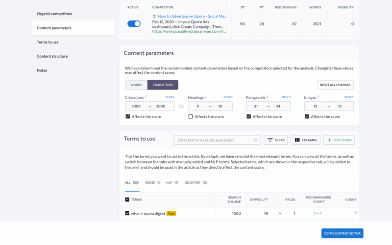 Once you’ve selected the right digital rivals, go over your upcoming article’s content parameters. Note that the default values in SE Ranking’s Content Marketing Platform are displayed as an average of every selected competitor, but you are free to change them as you see fit. Consider deciding on your own how many words or characters should be included in the text, how many headings and paragraphs the text should be broken down into, as well as how many images will make the text easier to read.