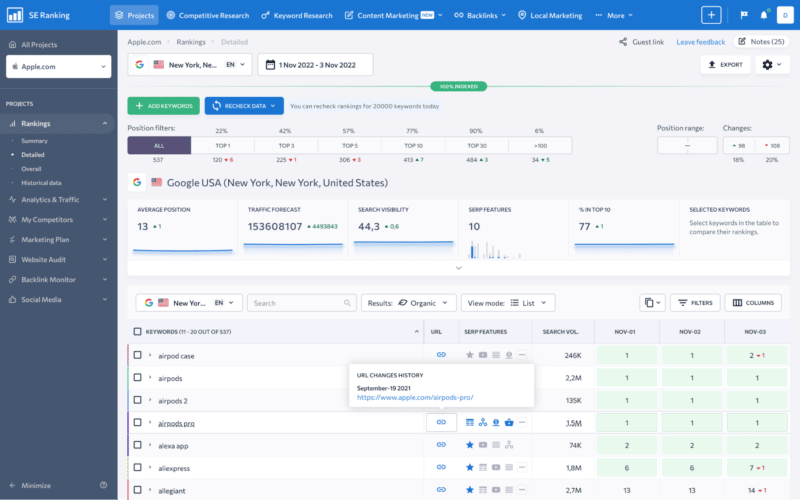 SE Ranking’s Keyword Rank Tracker delivers extensive ranking data with pinpoint accuracy across every major search engine. Add your website, specify the search engines and competitors, and keep daily track of your target keywords’ ranking positions.