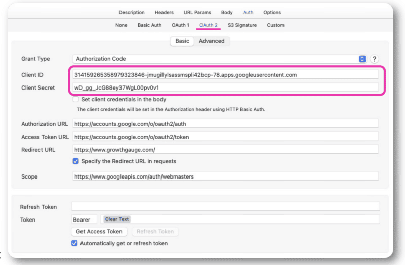 Once you get this info, you’ll have your client ID and client secrets, which you’ll add to your OAuth 2.0 authentication within either Postman or Paw.