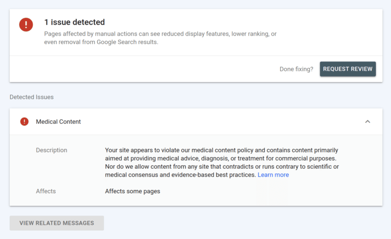 Google also brings attention to technical issues it identifies. While these may equally impact a site’s visibility in organic Google search, they are not related to any Google guideline violations and will be omitted here.