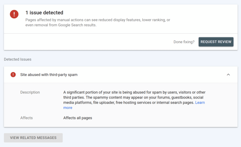This message tends to indicate that, at the time the recipient reads it, the most severe consequence has already come into effect and, in the majority of cases, the website is completely gone from organic Google Search. In some instances, however, the removal may affect only a subset of site pages.