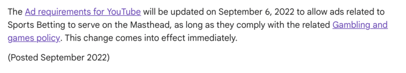 YouTube is now allowing sports betting ads to serve on the masthead as long as the ads comply with the related gambling and games policy.