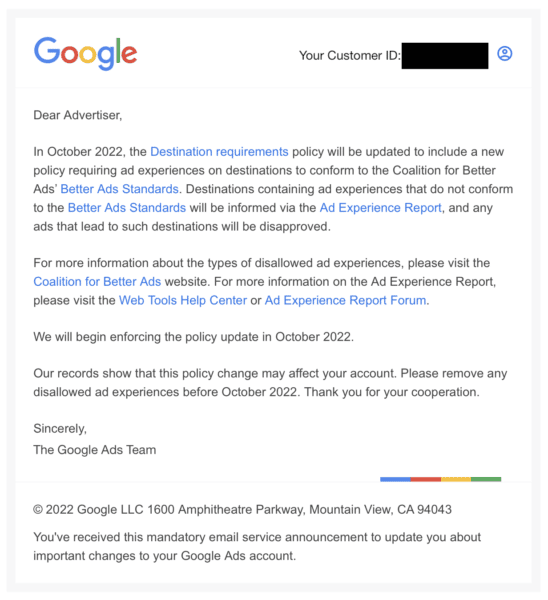 Starting next month, Google will update the Destination requirements policy requiring that ad experiences on destinations to conform to the Coalition for Better Ads Better Ads Standards.