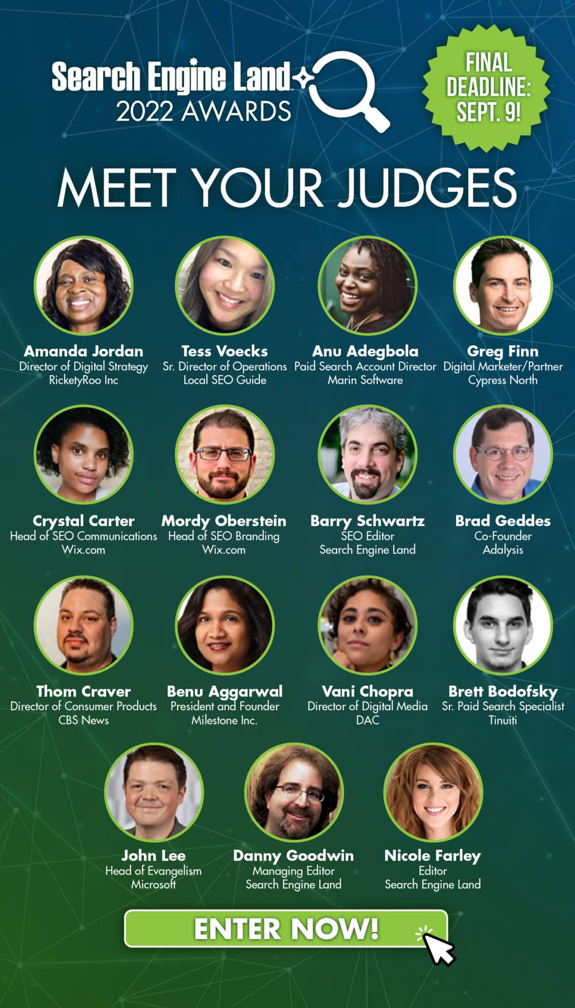 The final deadline is coming up at the end of this week – submit your application by 11:59pm this Friday, September 9 to be considered by our esteemed judging panel, featuring John Lee – Head of Evangelism at Microsoft, Cyrstal Carter – Head of SEO Communications at Wix.com, Thom Craver, Director of Consumer Products at CBS News, and more.