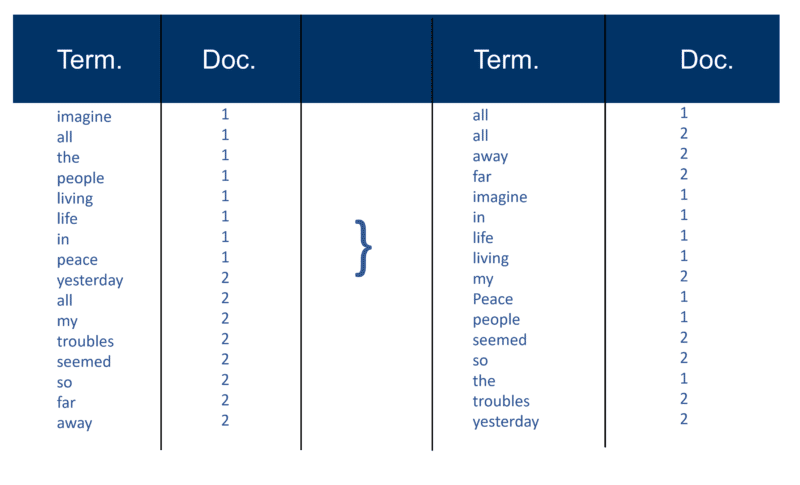 In my example this looks fairly simple at the start of the process, but the postings (as they are known in information retrieval terms) to the index go in one Doc at a time. Again, with millions of Docs, you can imagine the amount of processing power required to turn this into the massive ‘term wise view’ which is simplified above, first by term and then by Doc within each term.