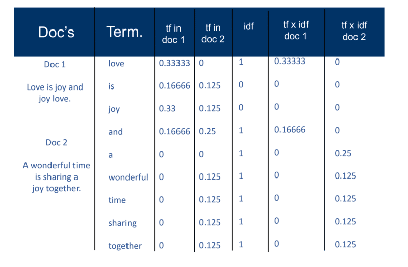 Once the search engine has created its ‘big index’ the indexer module then measures the ‘term frequency’ (tf) of the word in a Doc to get the ‘term density’ and then measures the ‘inverse document frequency’ (idf) which is a calculation of the frequency of terms in a document; the total number of documents; the number of documents which contain the term. With this further calculation, each Doc can now be viewed as a vector of tf x idf values (binary or numeric values corresponding directly or indirectly to the words of the Doc). What you then have is a term weight pair. You could transpose this as: a document has a weighted list of words; a word has a weighted list of documents (a term weight pair).
