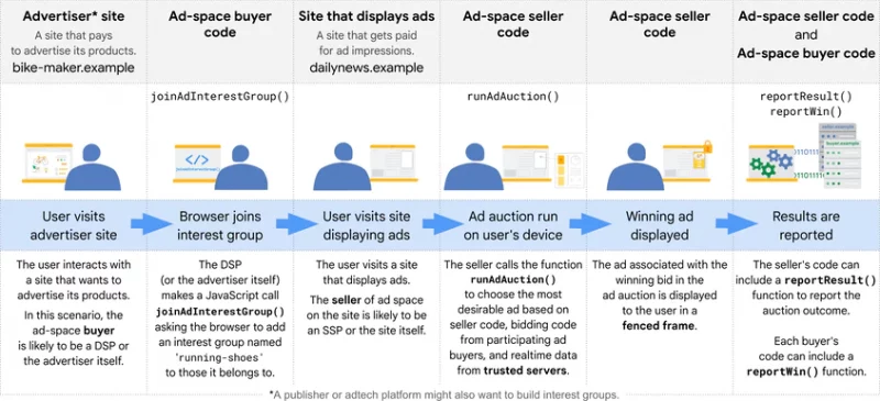 What is FLEDGE. The API uses interest groups to enable sites to display ads they believe are relevant to their users. According to Google, when a user visits a website that wants to advertise its products, an interest group owner (such as a DSP working for the site) can ask the user’s browser to add membership for the interest group. The group owner (in this example, the DSP) does this by calling the JavaScript function navigator.joinAdInterestGroup(). If the call is successful, the browser records: