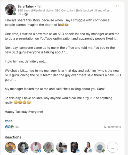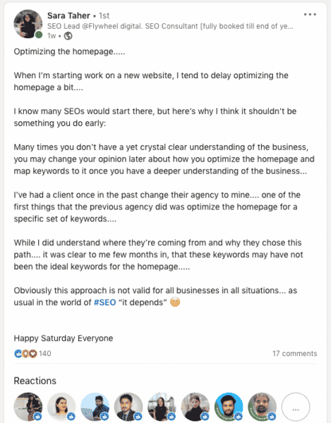 Whenever I visit LinkedIn lately, I almost always see an update from Sara Taher, the SEO Team Lead at Flywheel Digital.