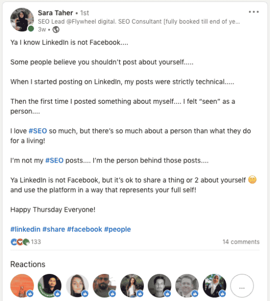 Taher was kind enough to give a little insight into her LinkedIn posting strategy. What follows are highlights of our Q&A. You may notice that much of the advice Taher shares aligns with LinkedIn’s advice for creators.