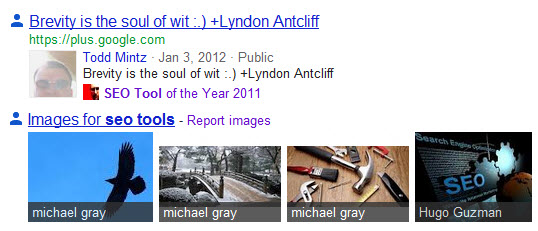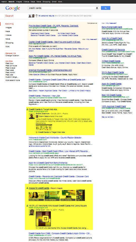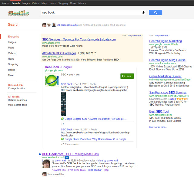 - “The users who have seen this in the wild are liking it, and our initial data analysis is showing the same.” Much like the Google Webmaster Tools shows that pages with a +1 in the search results get a higher CTR, this Google+ social stuff also suffers from the same type of sampling bias & giving the listings a larger and more graphical stand out further help them pull in much more clicks. Any form of visual highlighting & listing differentiation can lift CTR. I might be likely to click on some of my own results more, but when I do so you might just be grabbing a slice of navigational searches I was going to do anyway where I was looking for something else I posted on Google+ or my Google+ account or the account of a friend & so on. Further, aggregate data hides many data points that are counter to the general trend. I have seen instances of branded searches where the #1 organic site was getting a CTR above 70% (it even had organic sitelinks, further indicating it was a navigational search) and for such a search in some cases there were 2 Adwords ads above the organic results & then the Google+ page for a brand outranked the associated brand in the SERPs for those who followed it! That is a terrible user experience, particularly since the + page hasn’t even had any activity for months.
