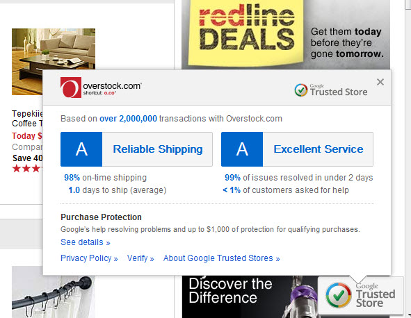 There recently was a question raised about how Google’s rating systems skewed high on the underlying data. Surely Overstock (the same Overstock Google penalized earlier this year) wouldn’t promote Google’s trusted stores aggressively on their own site if it made their business appear worse than it actually is, thus a positive bias must be baked in to the system.